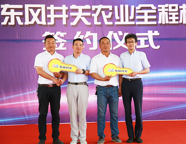 胡兆辉、卢锋共同为新洋分公司、东辛分公司农业全程机械化示范园授牌。苏志富、叶常青分别代表双方企业签约。丸尾、詹黎明分别为用户代表颁发交机钥匙。