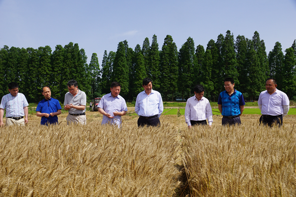 在"华麦5号"高产创建示范田,胡兆辉对该品种在新洋测产733.7公斤每亩再次刷新江苏省小麦单产历史最高纪录给予了高度赞赏。他指出,今年小麦稳产高产形势好,后期要时刻关注突发性天气变化,做好应对防范保障措施,力保收割冲刺阶段平稳高效过渡,确保"三夏"各项工作有序开展。