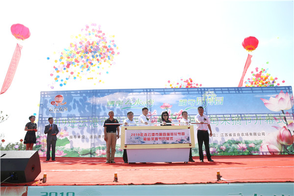 青山毓黛迎宾客,绿水含情荷飘香。又到了荷花盛开、荷香四溢的美好时节,7月20日上午,由连云港市文化广电和旅游局、连云港高新技术产业开发区指导,江苏省云台农场有限公司主办的“2019连云港市第四届荷花节暨葡萄采摘节”在云台农场“云水湾”湿地公园盛大开幕。连云港市副市长陈书军,省农垦集团党委委员、总会计师刘克英,高新区党工委书记陈佑龙等市、区相关单位部门,省农垦系统部分兄弟单位、陕西省农垦大荔农场公司等领导,农场公司党委书记、董事长、总经理刘卫华,党委副书记宋光锋、副总经理黄祖兵等场领导班子成员及近万名游客参加了开幕式。