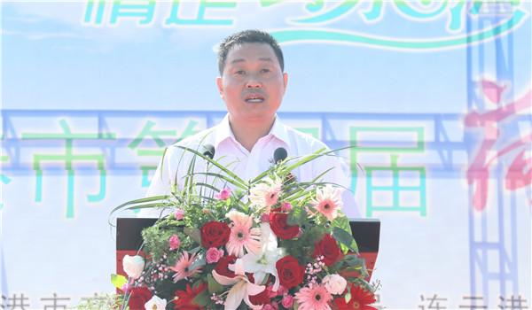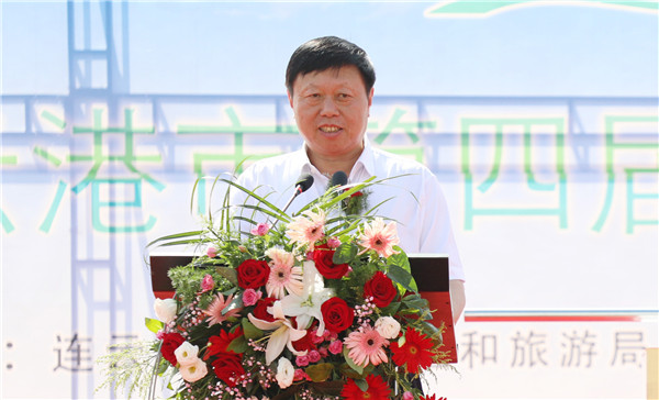 连云港市副市长陈书军宣布连云港市第四届荷花节开幕,并与省农垦集团总会计师刘克英、高新区党工委书记陈佑龙、市文化广电和旅游局副局长柏银枝、市自然资源和规划局局长孔令泰、农场公司党委书记刘卫华共同为开幕式推动启动杆,第四届连云港市荷花节正式开幕。