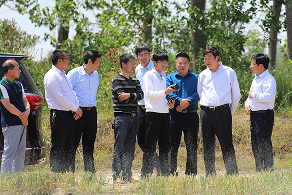 胡兆辉首先来到临海林苗一体化项目区5009公路“鹤乡绿径”及苏垦米业临海米厂拟建仓储项目区调研,肯定了临海林业的发展。他在二生产区踏田察看了稻麦超高产栽培及配套技术千亩示范片的麦子长势、长相,了解临海麦田管理及三夏工作的开展情况;在三生产区,对苏垦农发智慧农业园项目区及配套设施建设和绿化规划情况作了详细了解。在四生产区,胡兆辉步入正在收割的麦田,仔细察看麦田机械收割情况,又来到微喷灌育秧的秧畦边细心察看、了解水稻育秧及无人机飞防情况。他勉励现场工作的年轻农技人员,希望他们努力在干事创业中成长。