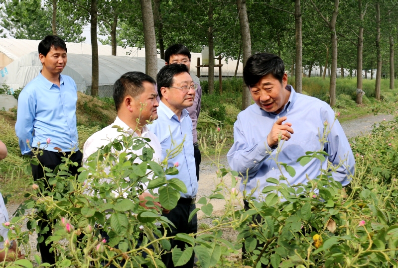 胡兆辉一行先后来到344国道新曹段7公里长绿色通道、匡东烘干线、何垛分场林下套种中药材基地、何垛分场小麦高产片、孙东大马士革玫瑰种植基地及香料公司玫瑰精油萃取车间等现场进行了考察。每到一处胡总经理都听取了新曹当前农业生产、产业转型发展等工作情况汇报,仔细询问了今年麦子生长情况、“三夏”各项准备工作、林业发展情况、“一朵花”玫瑰产业链发展状况等方面的工作。