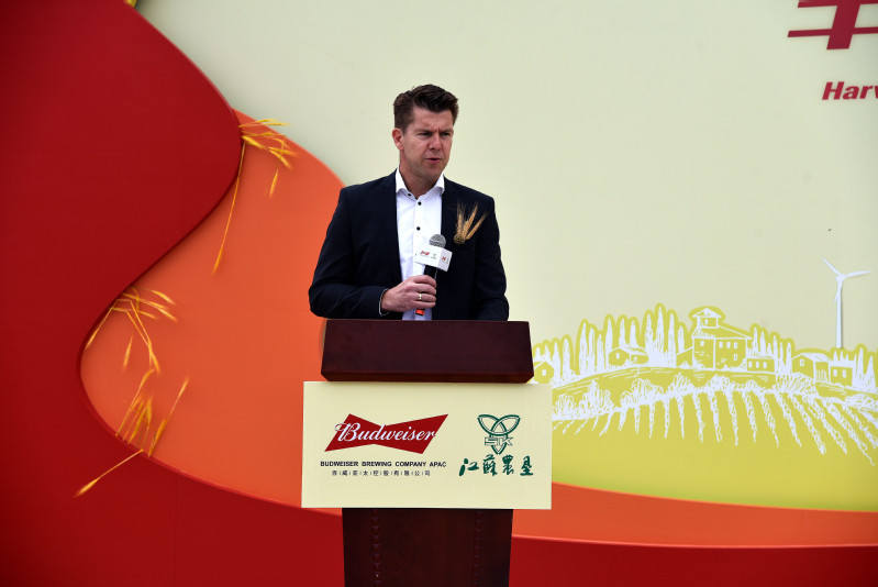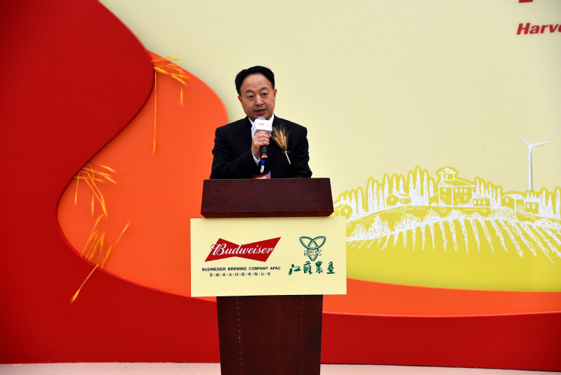 丰收仪式前,江苏农垦集团总经理胡兆辉向百威亚太、射阳县政府的各位嘉宾介绍了江苏农垦现代化农业种植等情况,并就大麦秸秆回收可持续利用等进行了介绍。